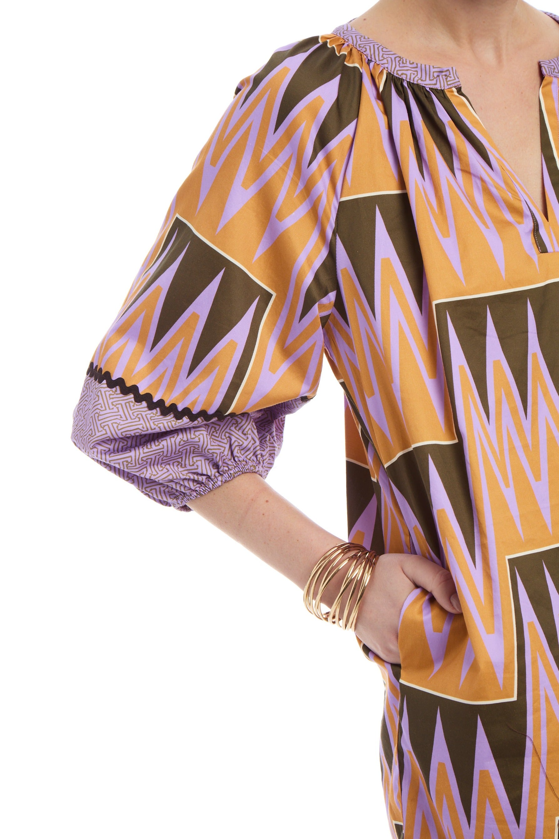 Como Dress with side pockets and rick rack trimming on sleeves.